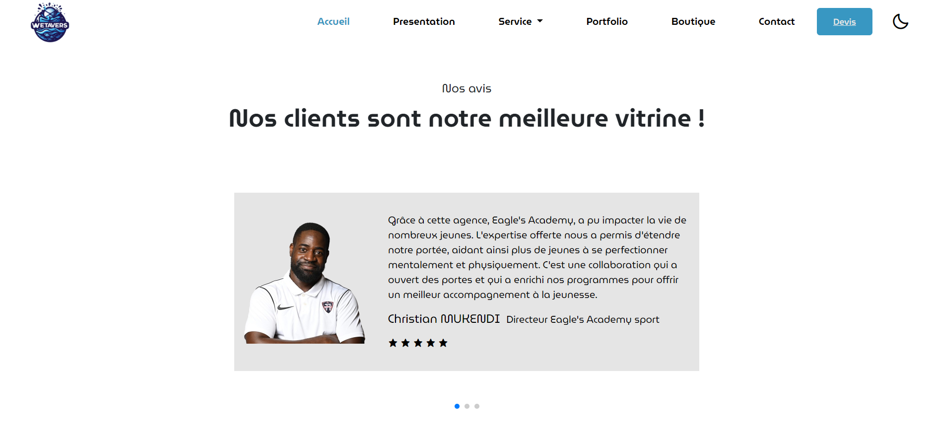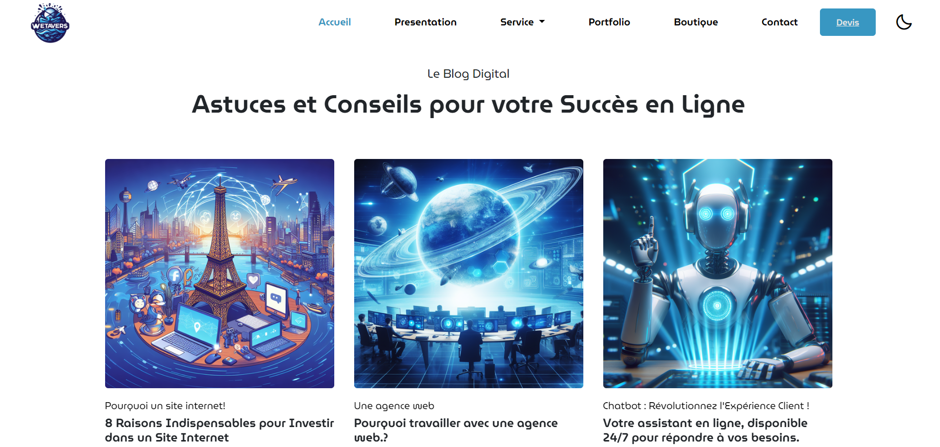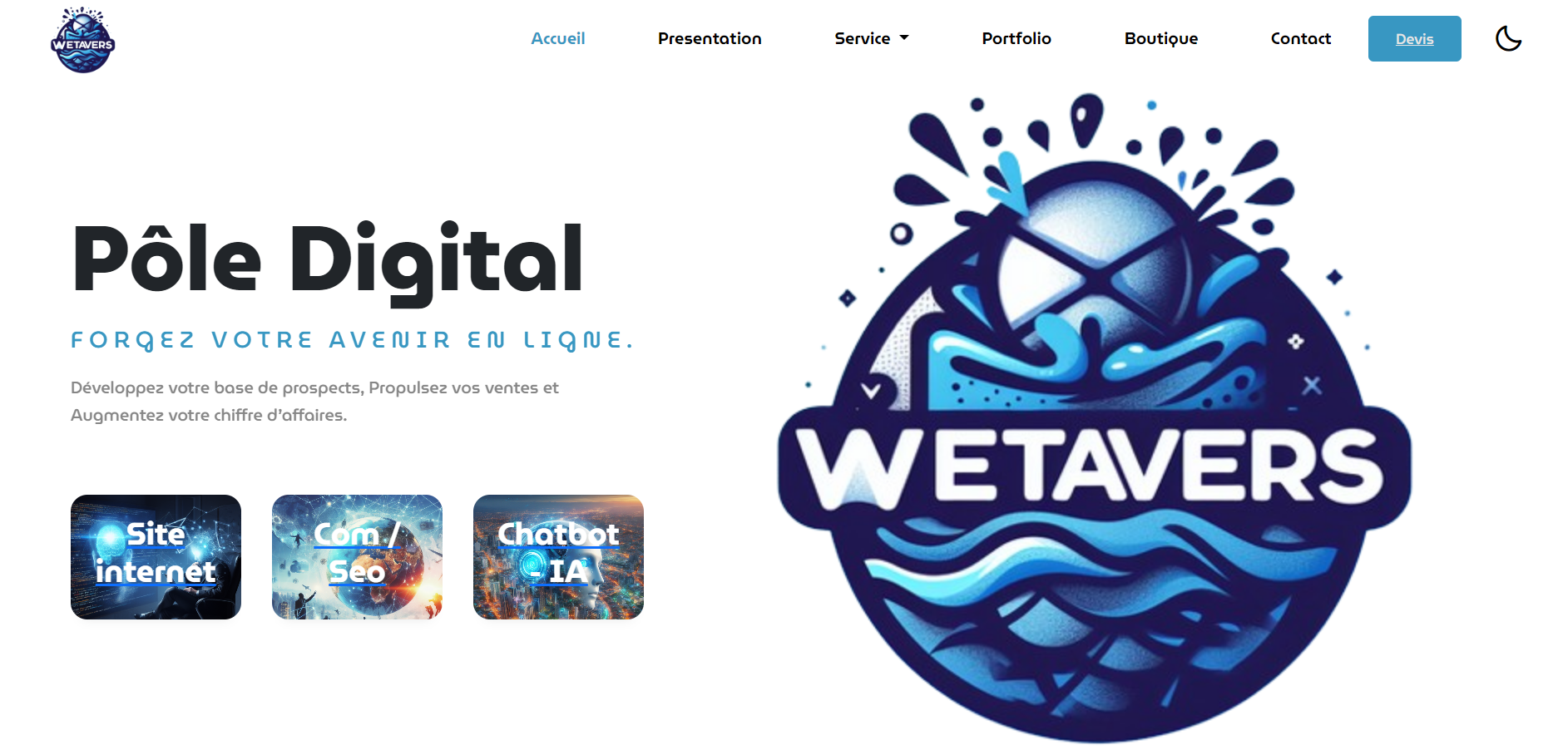 Chez Wetavers, notre passion pour la création web se reflète dans chaque pixel de notre propre site. En tant qu'agence dévouée à l'innovation et à la qualité, nous avons conçu cette plateforme avec le même dévouement que celui que nous offrons à nos clients. Explorez notre site pour découvrir notre expertise en conception, développement et stratégie web. Chez Wetavers, nous façonnons des expériences numériques exceptionnelles, et cela commence dès notre propre vitrine en ligne.